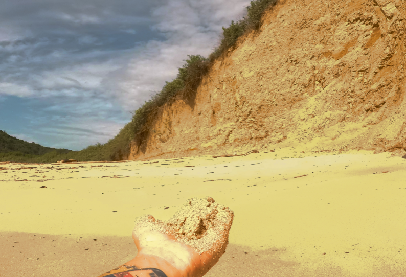 La comunidad ofreció llevarnos a conocer Playa Dorada desde el mar, llegando en lanchas. El mar se abría ante nosotros, vasto, brillante, libre… y sin embargo, inaccesible. “La verdad, yo solo he venido acá cuatro veces y nunca me he metido a la playa. Solo la he visto desde lejos”, confesó uno de los comuneros. Esa frase me empujó. Me lancé al agua, sentí la sal, la historia, la ausencia. Pensé en lo que implica que un mar ancestral sea cercado como si tuviera un único dueño. Playa Dorada no es solo un punto en el mapa ni una postal turística: fue y es un espacio ancestral, parte vital del tejido cultural y espiritual del pueblo de Salango.