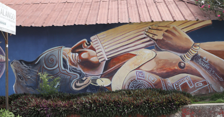 Salango está lleno de murales. Diez, quizá más. Colores vibrantes, figuras ancestrales, pescadores, spondylus, atardeceres eternos pintados sobre las paredes. Cada mural es una ventana al pasado, pero también un grito de identidad en el presente.