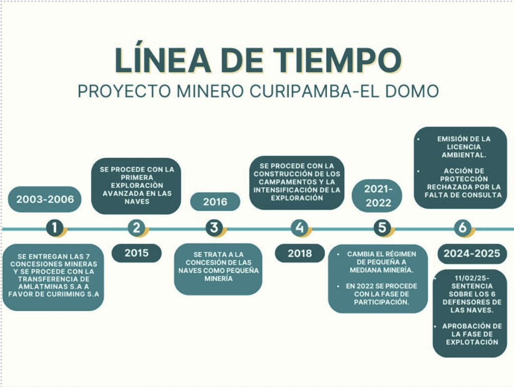 Tras de este proceso negligente y vulnerador de los derechos de la comunidad y la naturaleza, se destacan un montón de faltas y un abuso de la institucionalidad del MAATE para otorgar una licencia ambiental y validar una consulta ambiental, que vulnera los derechos de los campesinos. Teniendo en cuenta que Las Naves cuenta con una población de 7012 personas, de las cuales 5028 pertenecen al área rural y sustentan la vida directamente de los cauces de agua del Domo (donde se ubica la relavera de Curimining S.A). Se trata de una vulneración consecutiva de sus derechos que parte desde una ausencia de la consulta ambiental hasta un riesgo de sufrir afectaciones sobre los derechos al agua, el territorio, la salud, sin mencionar la constante vulneración al debido proceso, derecho a la defensa de su territorio, y sobre todo el derecho a la resistencia de los seis defensores que se encuentran enfrentando una sentencia sin pruebas conclusas.