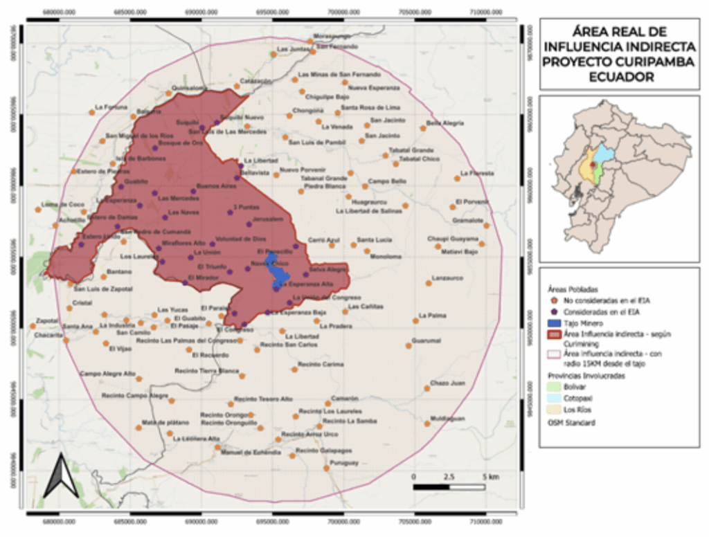 Finalmente, se destaca una falta muy grave del MAATE, que aprobó el EIA con una delimitación del área de influencia indirecta basada en la delimitación territorial y delegando la consulta ambiental a una compañía privada, cuando es su deber constitucional efectuarla. En el siguiente mapa de una investigación independiente (en colaboración para INREDH) podemos apreciar un mapa, en el que se muestra a otras comunidades afectadas en un radio de 15km, evidenciando el verdadero impacto fuera de la delimitación territorial de Las Naves, que no fue analizada por el EIA de Curimining S.A, ni observada por el MAATE.